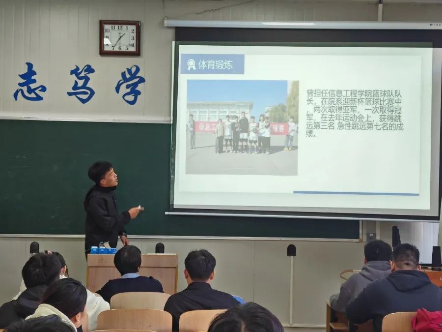 答辩环节,同学们以自信饱满的状态轮流上台答辩,从学习情况、所获奖项、实践经历和家庭情况等几方面进行阐述。