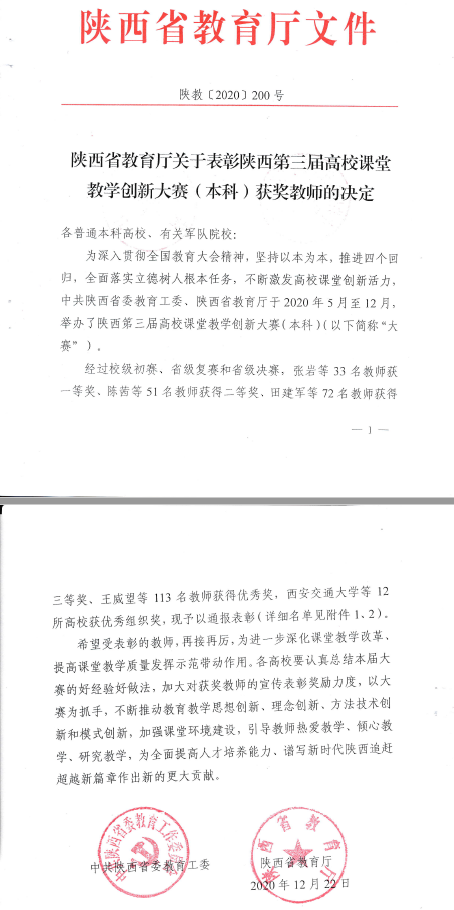 为贯彻全国教育大会精神,坚持以本为本,推进四个回归,加快推进“四个一流”建设,不断激发高校课堂教学活力,中共陕西省教育工委办公室、陕西省教育厅办公室联合举办的主题为“课堂革命,陕西行动”的第三届陕西本科高校课堂教学创新大赛于2020年5月至12月举行。bevictor伟德高燕老师代表伟德官网bv参加本次大赛,经过校级初赛、省级复赛、升级决赛的层层选拔,最终高燕老师斩获省级二等奖。