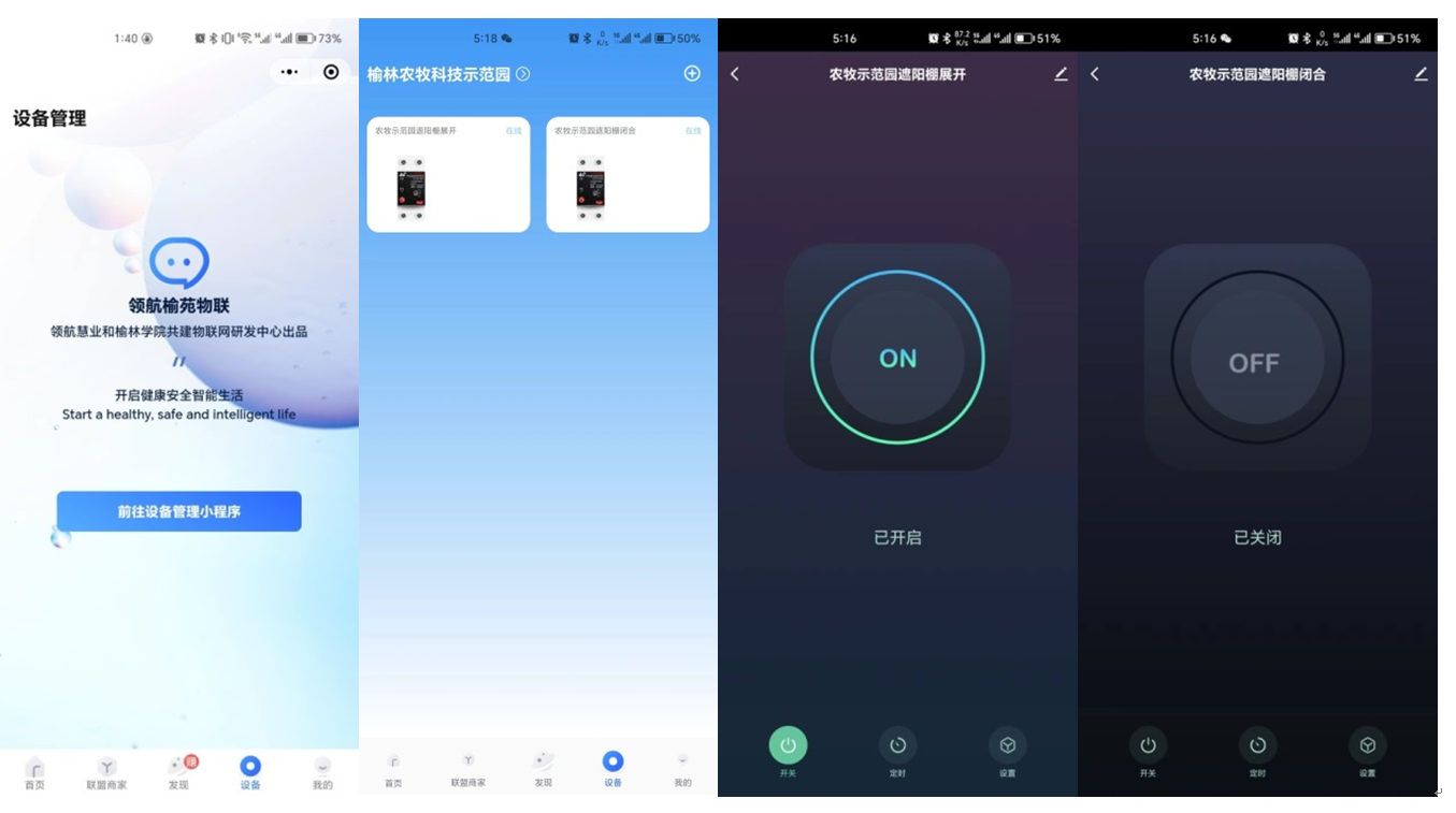 该系统利用两个远程开关实现对380伏高压电机正转和反转电平的控制。两个控制开关通过4G无线移动通信系统实现了物联网的接入,同时发送状态数据和接收控制指令。智能终端的领航榆苑物联网控制界面中,两个对应虚拟开关的通过物联网连接两个现场的两个控制开关,两个虚拟开关可实现对遮阳/遮雨棚的控制。