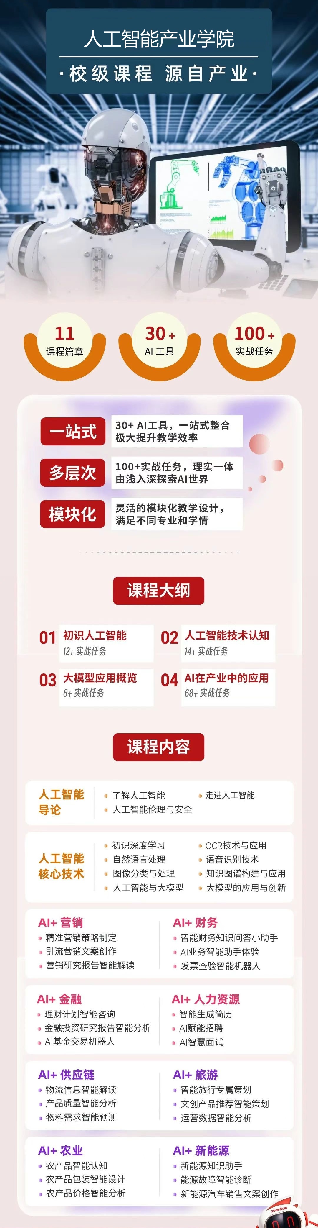 公司通过成立人工智能通识虚拟教研室和积极参与全国应用型高校人工智能通识虚拟教研室各项活动,推动教学资源共建共享,联合开发优质教材,探索人工智能通识教育的多元课程考核评价机制,将人工智能通识教育与产业公司深度融合,形成“理论+案例+实训”三位一体的教学模式。在课程设计中,分层次递进产教协同人工智能教育创新实验室,创新人工智能通识课教程,坚持以人工智能通识与专业知识融合、产业需求与创新实践教育融合为抓手,结合各学科专业特色,系统性设计人工智能+微专业、人工智能+微课程等人才培养体系,分类分层建设AI通识课程模块、AI专业交叉课程模块和高阶AI创新课程模块等,全面提高员工的人工智能知识素养和创新思维,培养满足人工智能时代需求的创新人才。
