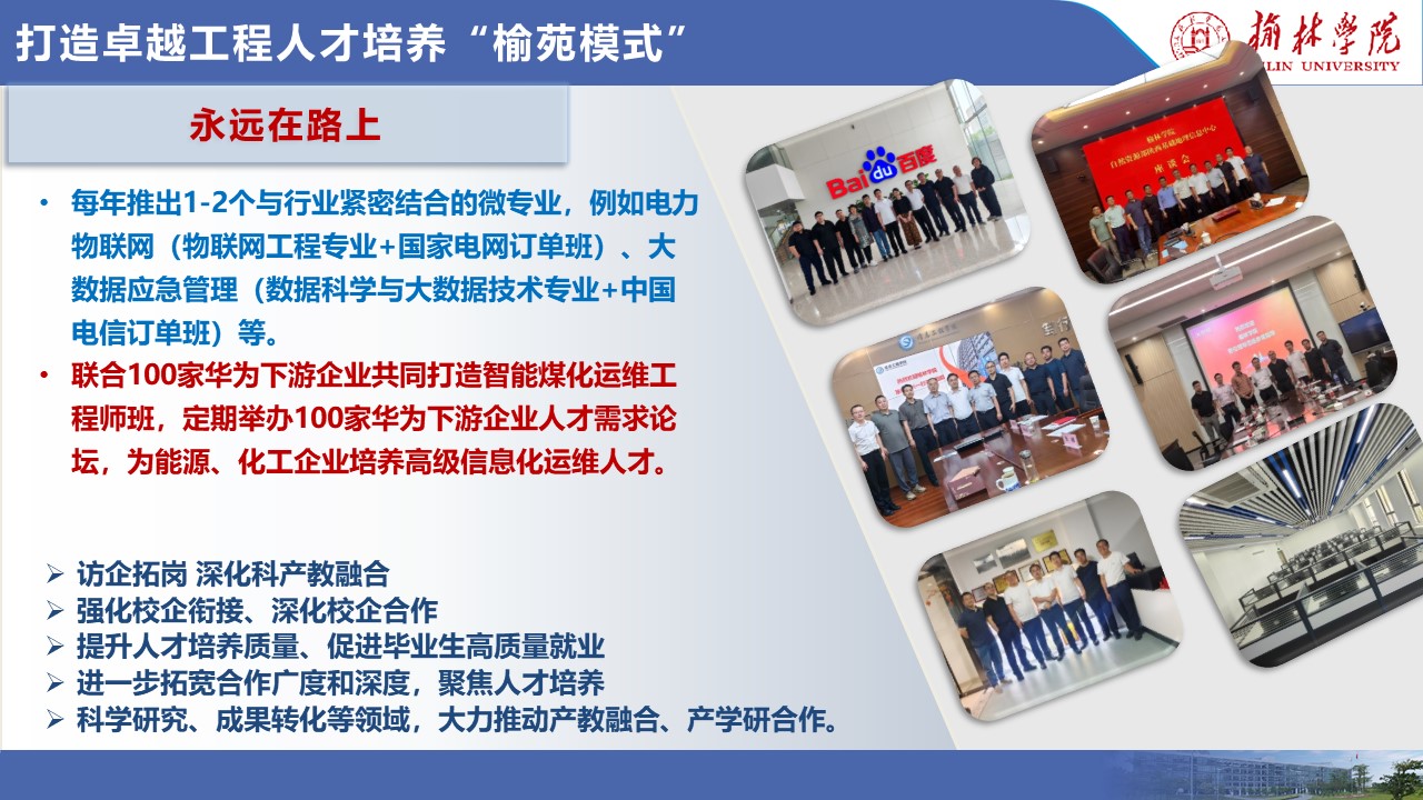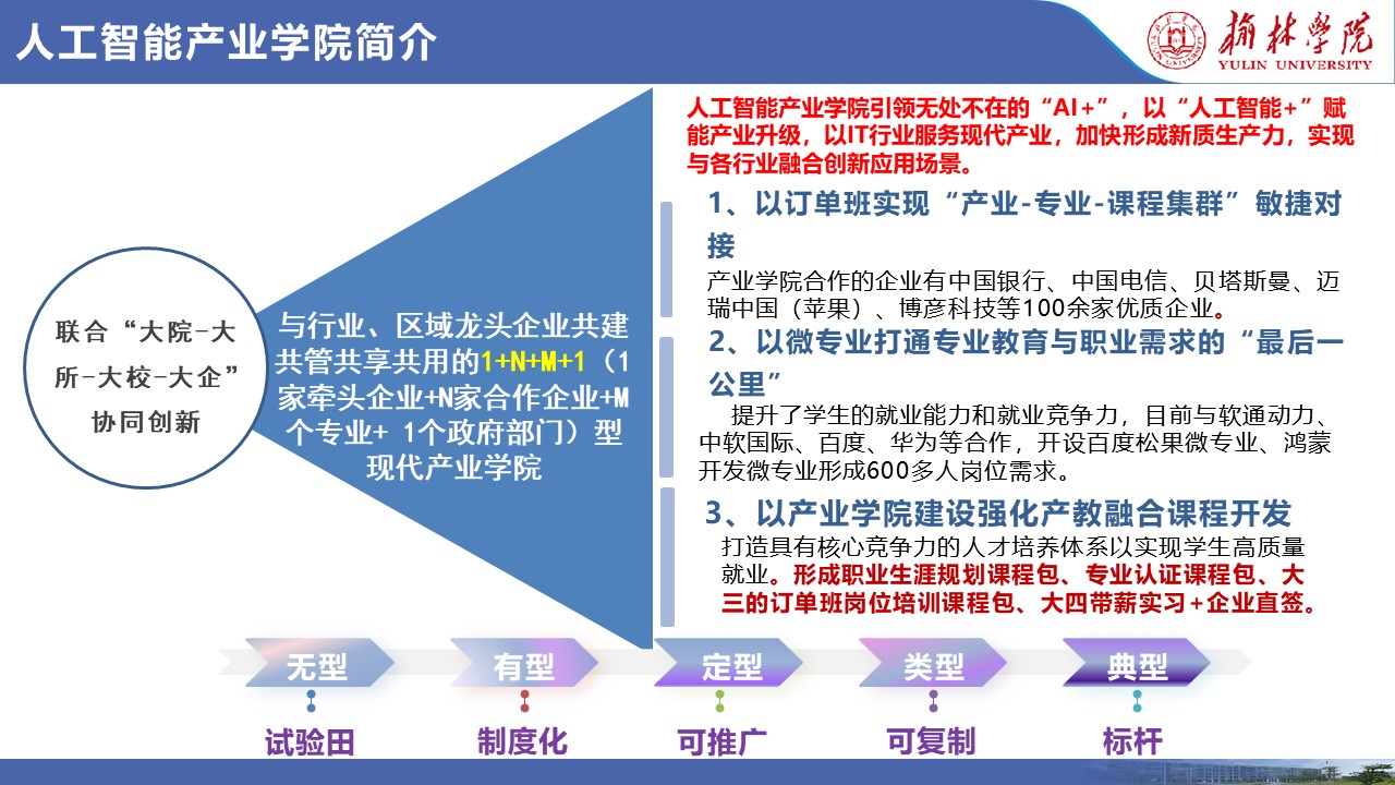 专业特色:本本专业依托公司计算机科学与技术学科优势及华为ICT公司,利用公司在计算机视觉、大数据处理及软件工程等领域的团队力量,突出人工智能技术与榆林市能源化工、新材料和现代农业等产业的交叉与融合,为本科生构筑扎实的人工智能理论基础和专业知识体系;注重强化员工的人工智能建模与算法分析设计能力、解决能源化工、新材料和现代农业等行业人工智能应用问题的实践能力,强调员工的个性化科学思维和创新实践能力的培养;培养能够进行人工智能算法分析与设计、人工智能技术应用和人工智能等复杂工程问题分析与解决的高级应用型人才。
